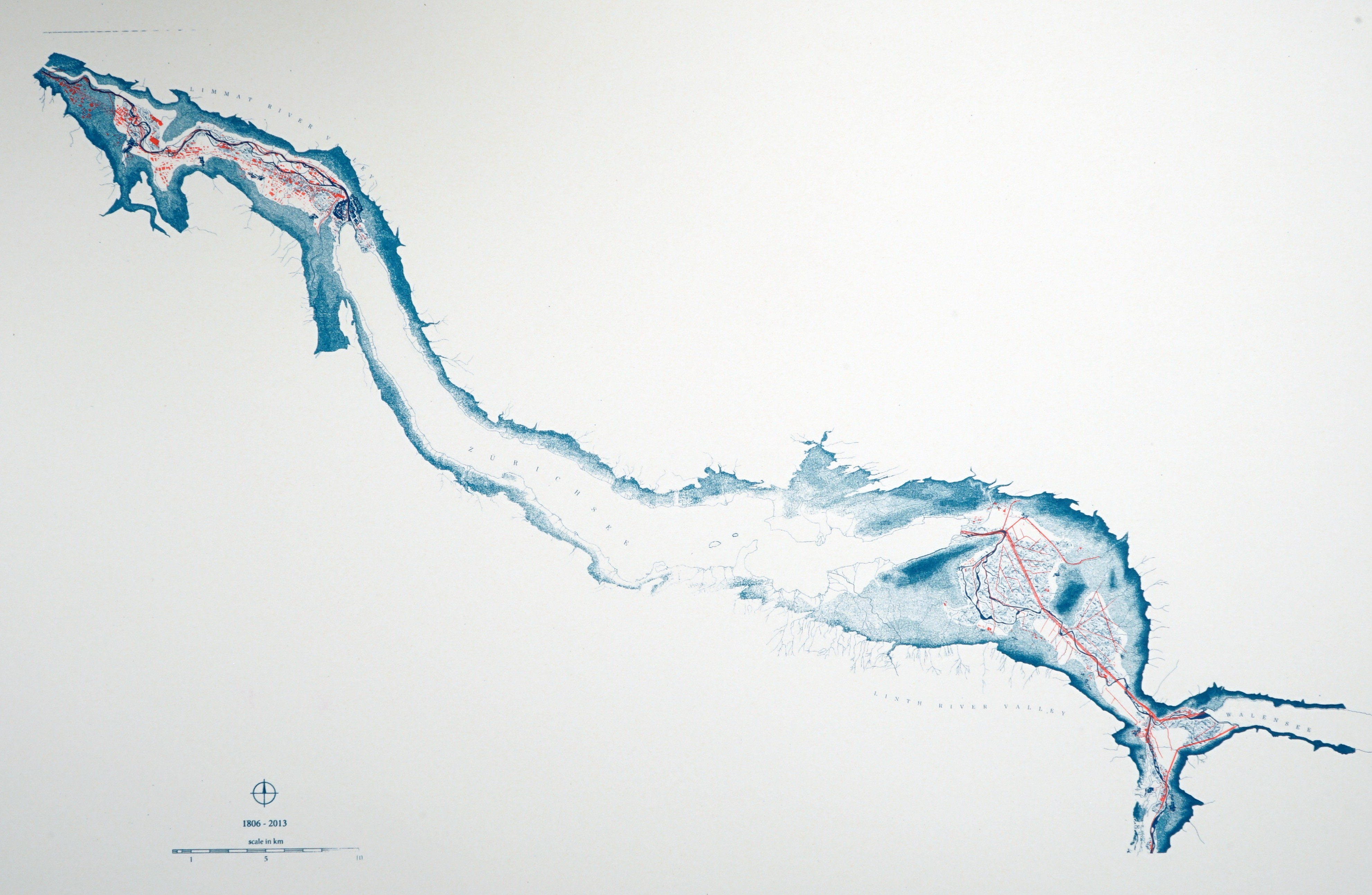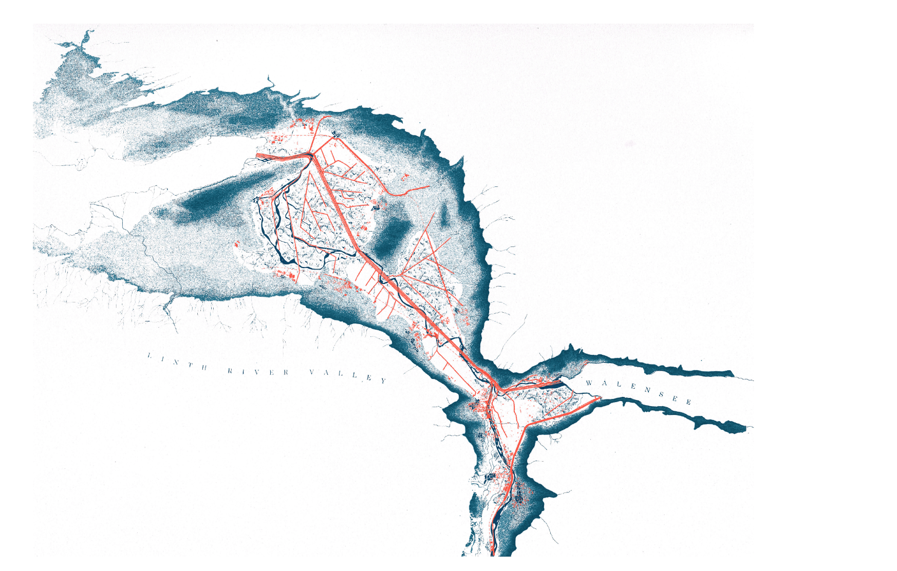 Die Flüsse Linth und Limmat sind Teil des gleichen Flusssystems und sind durch jahrhundertelange, menschliche Eingriffe eng miteinander verbunden. Die Meliorationen der Linthebene durch den Kanalbau ab 1806 schuf neue Landwirtschaftsflächen und ermöglichte die Stabilisierung des Wasserpegels des Zürichsees. Damit wurde die Voraussetzung für die Hinwendung der Stadt zum See und eine Entwicklung entlang der Limmat geschaffen. Während zeitgenössische Planungspraktiken sich ausschliesslich auf die innere Verdichtung konzentrieren, zeigt die Geschichte von Linth und Limmat eine Alternative auf: Eine Haltung, in der Landschaftsformen und urbane Systeme Teil einer gesamthaften, territorialen Komposition werden. Dabei spielen unterschiedliche Formen von urbaner Intensität eine strategische Rolle bei der Gestaltung neuer, territorialer Narrative. Dieser Beitrag wurde im Rahmen der Wahlfacharbeiten zu «Projects on Territory» erstellt und war Teil der Ausstellung DICHTELUST im Schweizerischen Architekturmuseum, November 2018 – Mai 2019. Das Wahlfach wurde von den Professoren Marc Angélil und Milica Topalovic über einen Zeitraum von drei Semestern gemeinsam durchgeführt. Es wurde von Metaxia Markaki in Zusammenarbeit mit Ferdinand Pappenheim und Sascha Delz mit Unterstützung der Siebdruckkünstlerin Esther Schena und dem Dynamo Workshop in Zürich organisiert und unterrichtet. Besonderer Dank gilt unseren studentischen Hilfskräften Michiel Gieben und Oliver Burch und allen teilnehmenden Studierenden.