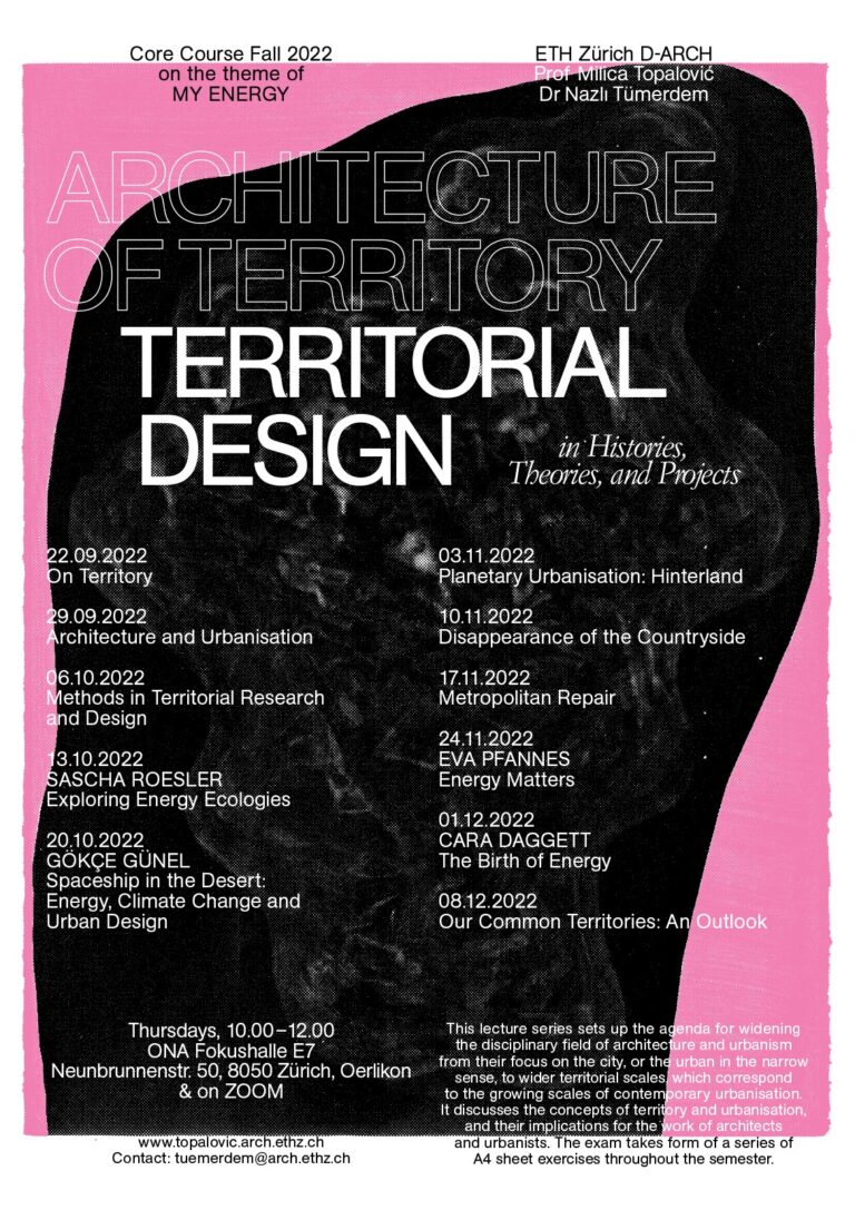 This lecture series sets up an agenda for widening the disciplinary field of architecture and urbanism to territorial scales, corresponding to the increasing scales of contemporary urbanisation. Within the theme MY ENERGY, the four guest speakers engaged in fields ranging from energy humanities and feminist political ecology, to urban history and urban design, will approach the notions such as energy transition, decarbonisation, genealogy of energy, and urban microclimates.