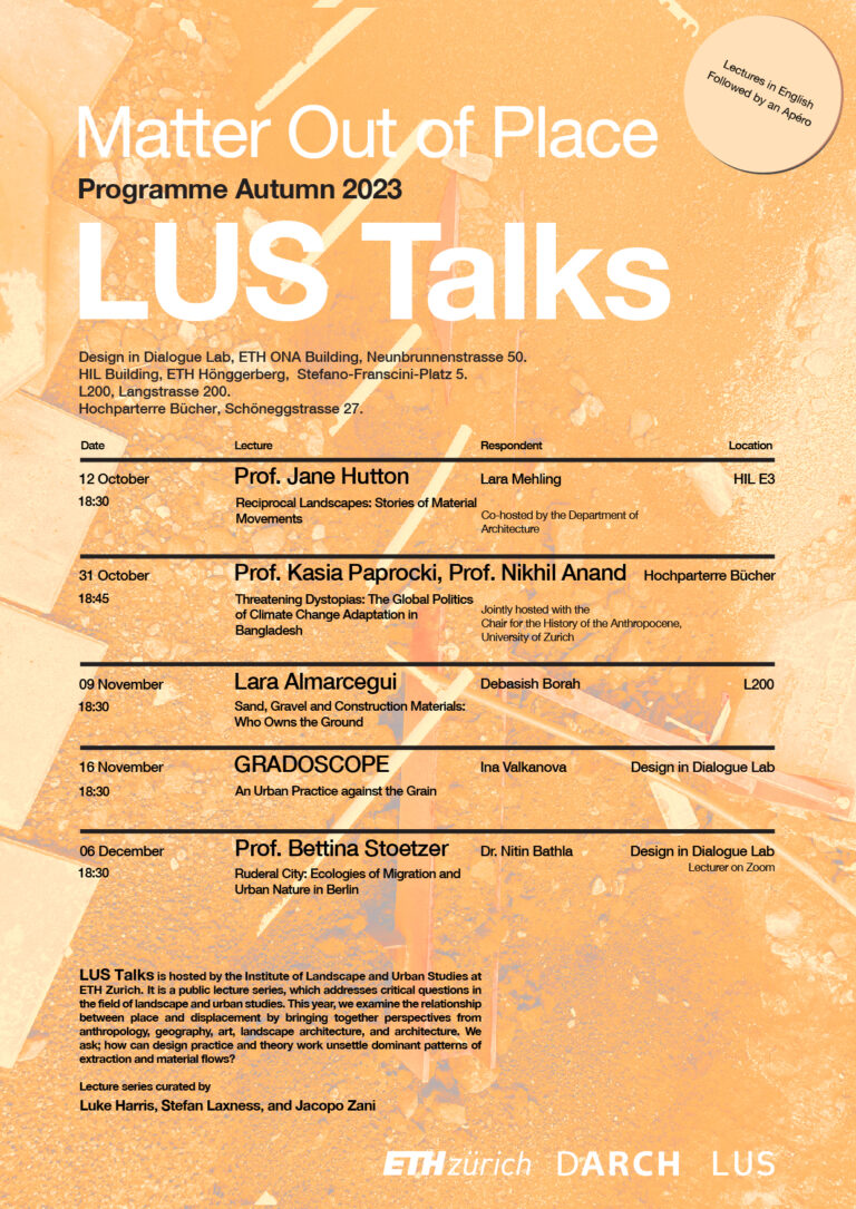 This year, we examine the relationship between place and displacement by bringing together perspectives from anthropology, geography, art, landscape architecture, and architecture. We ask; how can design practice and theory work unsettle dominant patterns of extraction and material flows? The LUS Talks are curated by Luke Harris, Stefan Laxness, and Jacopo Zani and are followed by an apero.