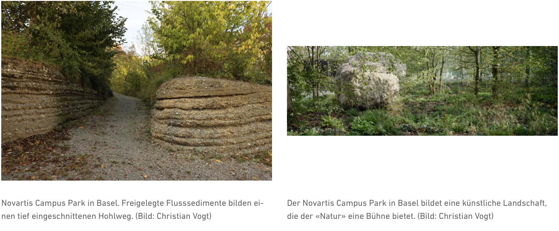 Vogt gelingt es mit seinen Entwürfen immer wieder, die natürlichen Eigenschaften eines Ortes herauszuschälen und erfahrbar zu machen. So auch beim Novartis Campus Park in Basel, wo er aus freigelegten Flusssedimenten tief eingeschnittene Hohlwege schafft. Zwischen den oberen Parkteilen und dem Rhein entsteht eine künstliche Landschaft, die der «Natur» eine Bühne bietet.