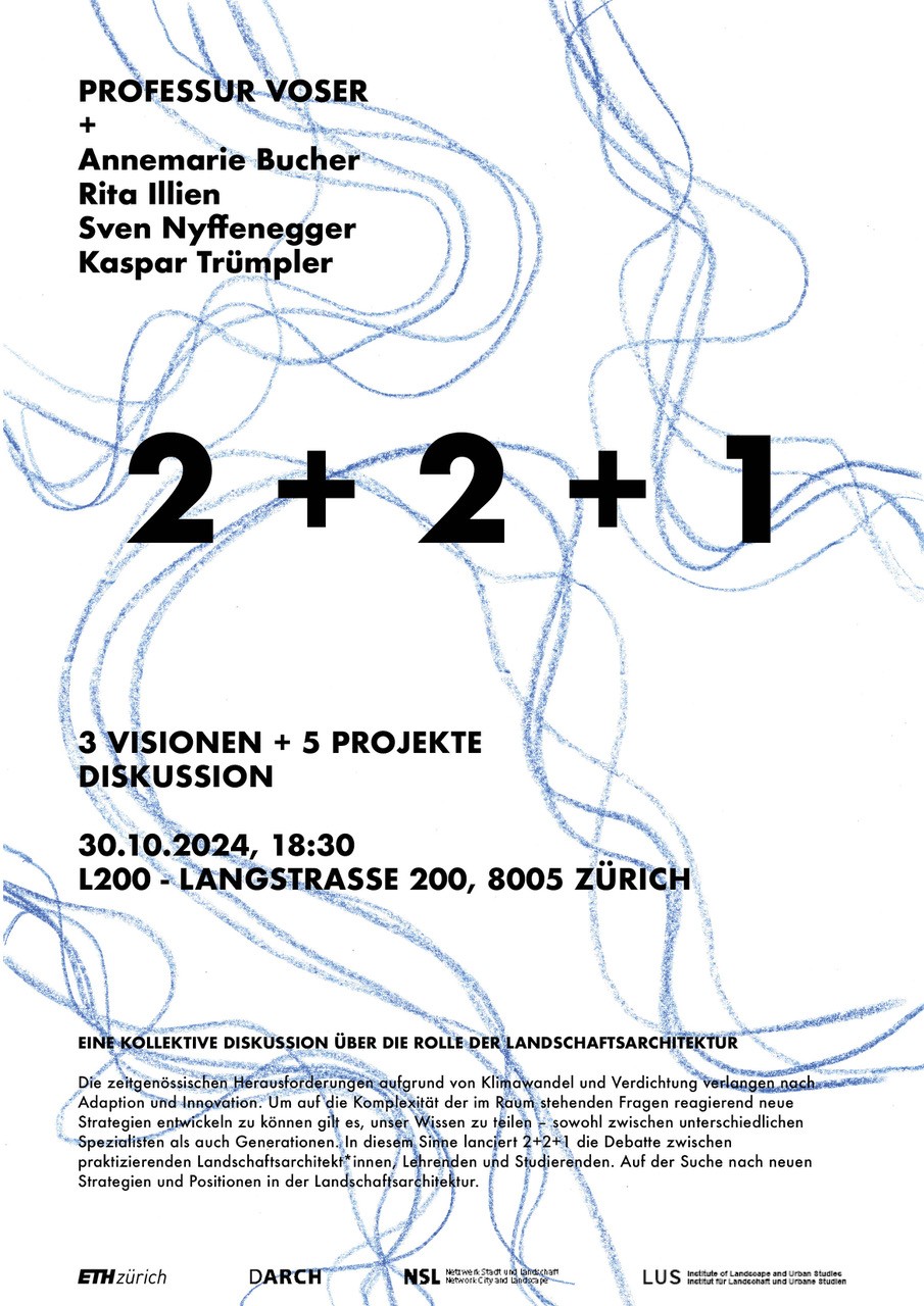 Die zeitgenössischen Herausforderungen aufgrund von Klimawandel und Verdichtung verlangen nach Adaption und Innovation. Um auf die Komplexität der im Raum stehenden Fragen reagierend neue Strategien entwickeln zu können gilt es, unser Wissen zu teilen – sowohl zwischen unterschiedlichen Spezialist*innen als auch Generationen. In diesem Sinne lanciert 2+2+1 die Debatte zwischen praktizierenden Landschaftsarchitekt*innen, Lehrenden und Studierenden. Auf der Suche nach neuen Strategien und Positionen in der Landschaftsarchitektur.