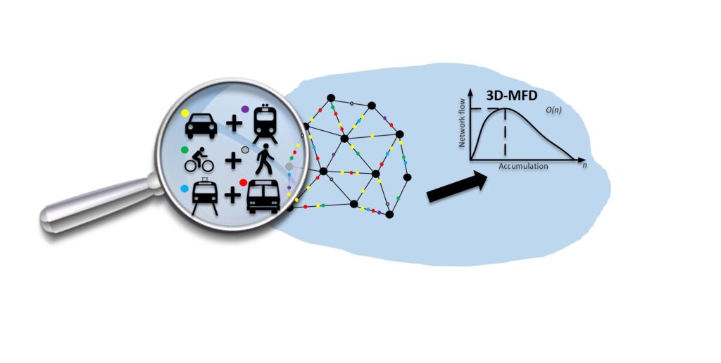 Um die Physik der urbanen Mobilität zu verstehen, muss die Verkehrsdynamik multimodaler Stadtnetze unter vielen verschiedenen Szenarien, einschliesslich verschiedener Netzeigenschaften, analysiert werden. Zu diesem Zweck kann ein aggregiertes Modell für multimodale Systeme, das dem Konzept des „three-dimensional bi-modal macroscopic fundamental diagram (3D-MFD)“ [dreidimensionalen, bimodalen, makroskopischen Fundamentaldiagramms] folgt, verwendet werden, um die Auswirkungen der Netzwerktopologie und -konfiguration, der Strassenraumzuweisung und der Verkehrssignalregelung auf die multimodale Verkehrsleistung zu untersuchen.