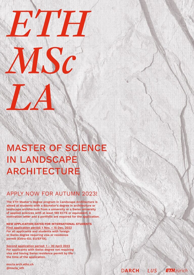 Apply now for Autumn 2023! The ETH Master‘s degree programme in Landscape Architecture is aimed at students with a Bachelor‘s degree in architecture or landscape architecture from a university or a Swiss university of applied sciences with at