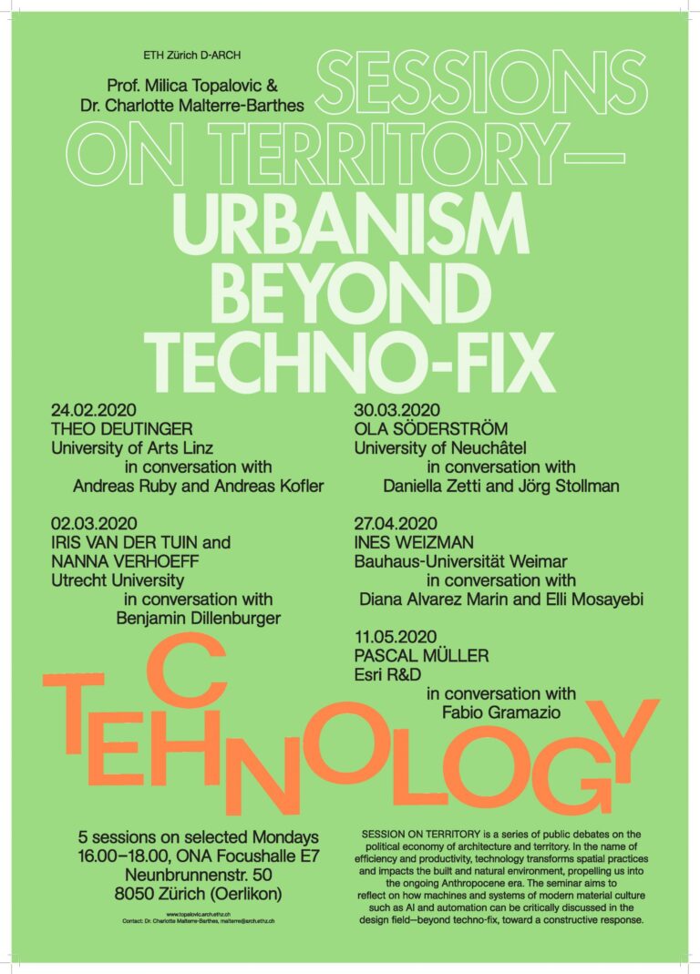 5 sessions on selected Mondays, 16:00–18:00 | Architecture of Territory, Prof. Milica Topalović Lecture Series | ETH Zurich, Oerlikon, ONA Focushalle E7, Neunbrunnenstrasse 50.