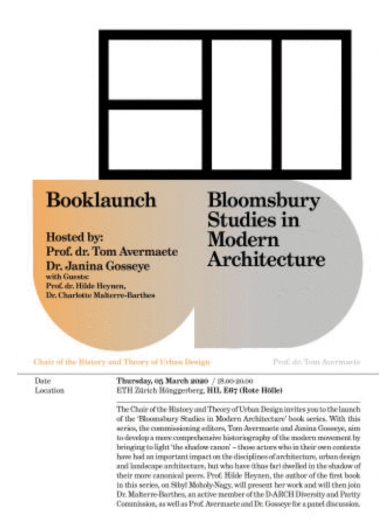 5 March, 18:00 | Launch Book Series | Rote Hölle, HIL, ETH Zurich, Hönggerberg With Prof. Hilde Heynen (KU Leuven). With this series, the commissioning editors, Tom Avermaete and Janina Gosseye, aim to develop a more