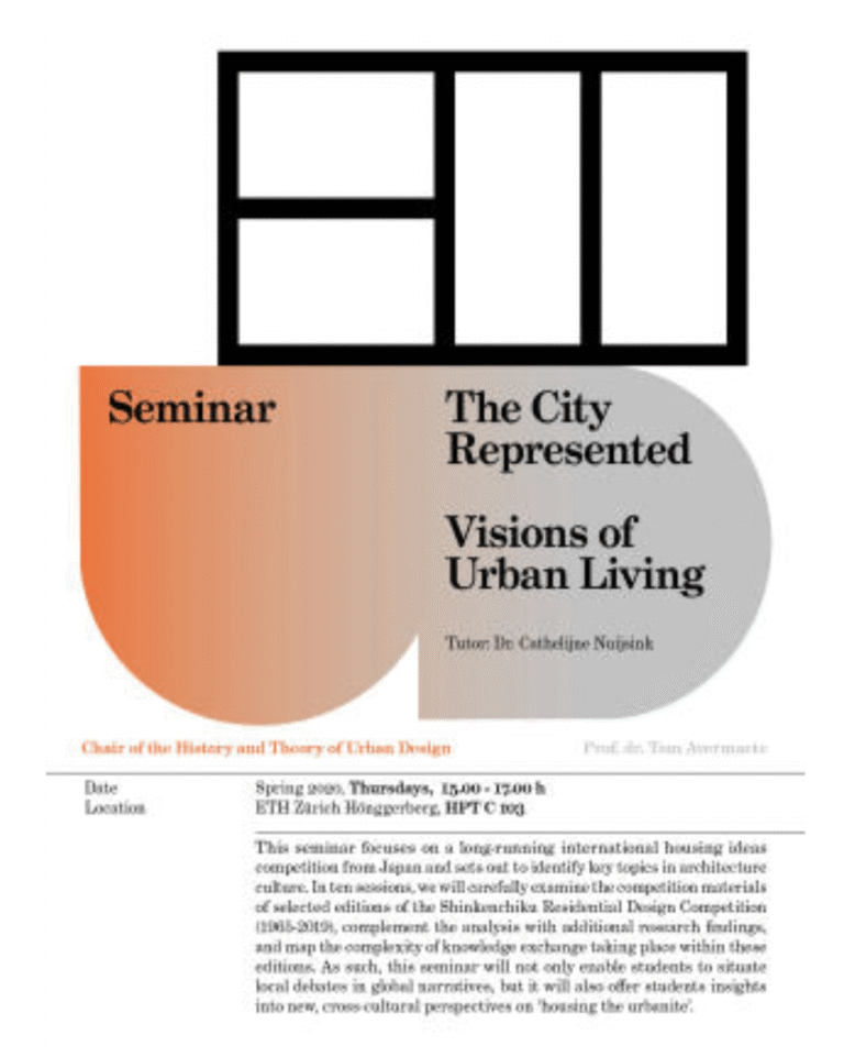 14 May | 15:00–17:00 | Final Presentations Seminar | ETH Zurich Hönggerberg, HPT C 103 Lecturer: Dr. Cathelijne Nuijsink. This seminar takes a long-running international housing ideas competition from Japan to identify key topics in architecture