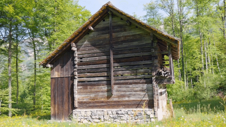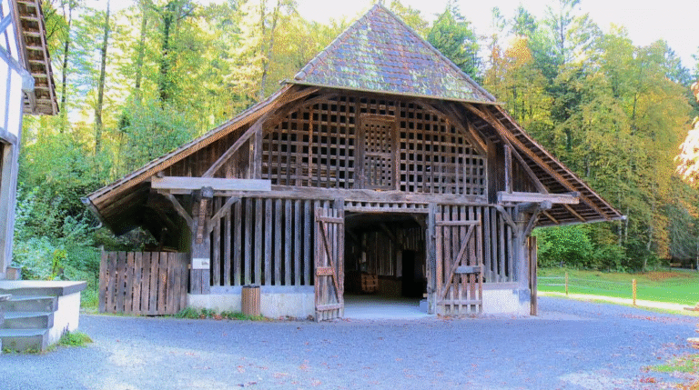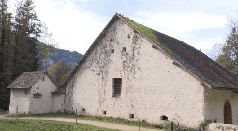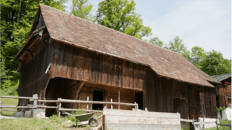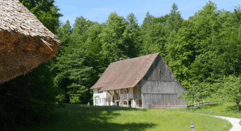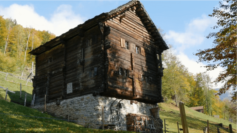 Was steht heute in Meggen, wo einst diese Stallscheune stand? Wo einst gemostet wurde, wird heute gemietet. Freilicht Museum der Schweiz Ballenberg