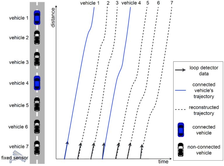 Inference of detailed vehicle trajectories is crucial for applications such as traffic flow modeling, energy consumption estimation, and traffic flow optimization. Static sensors can provide only aggregated information, posing challenges in reconstructing individual vehicle trajectories.