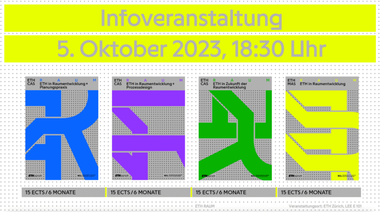 05. Oktober 2023, 18:30-20:00 Uhr | ETH Zentrum, Gebäude LEE, Hörsaal E 101. Informationsveranstaltung des Weiterbildungsprogramms MAS CAS in Raumentwicklung der ETH Zürich mit anschliessendem Apéro. Organisation Institut für Raum- und Landschaftsentwicklung, ETH RAUM. Contact: Lidija